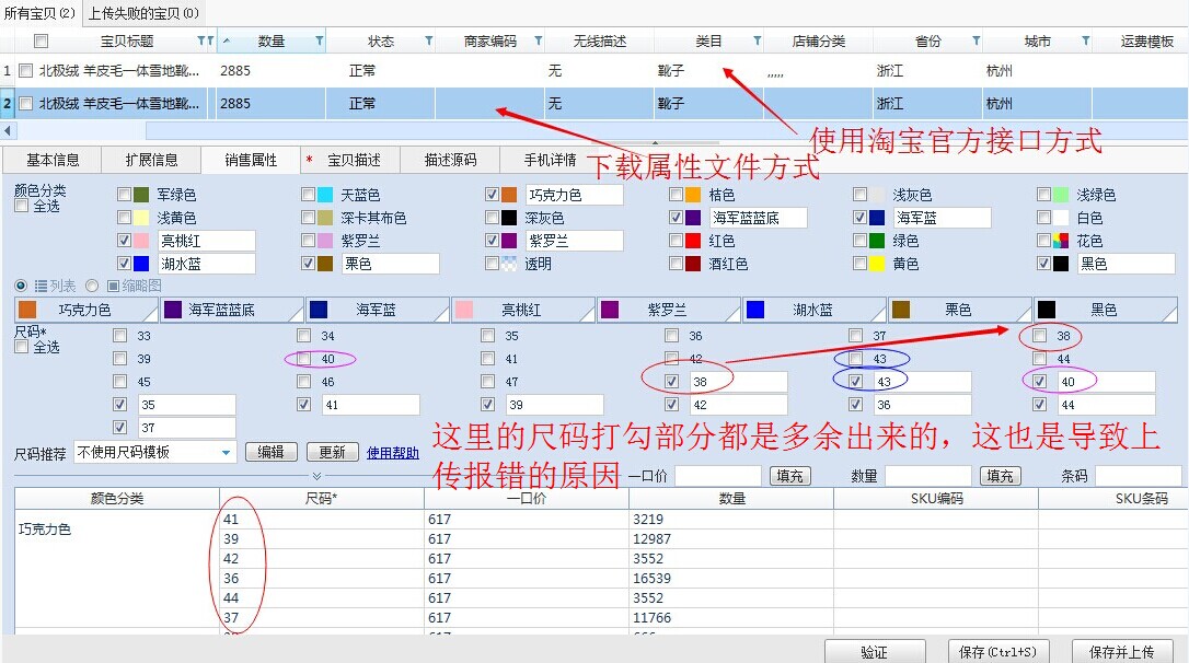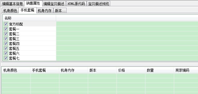 问题原因:原来的宝贝在以前上传的那个时间点,销售属性只有三种类型,而现在淘宝对“手机”类目更新之后,销售属性类型变成了四种。销售属性如果要在下面表格里面显示出来,四种类型每一种都至少要选中一个名称,缺一不可。