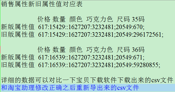 我们来对比一下宝贝下载软件下载出来的csv文件和淘宝助理修改正确之后重新导出来的csv文件,可以看出销售属性组合里面的尺码属性值不一样,导致导入淘宝助理之后尺码要么是空白的,要么是多余重复的