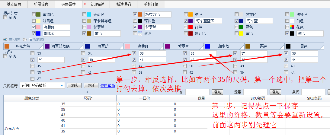 1、相反选择,比如有两个35的尺码,先把第一个选中,再去掉第二个的打勾;其它尺码依次类推操作,直到把多余那一部分的尺码全部打勾去掉,方便等会淘宝助理自动清除;