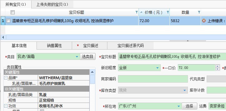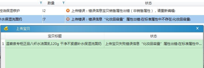 问题原因:说明“化妆品容量”已经从原来的用户输入属性更新为单选属性,用Excel打开CSV文件可看到输入属性的相关信息,但实际上已经没有该项输入属性,淘宝助理也不会自动将残留的数据删除,导致上传失败。