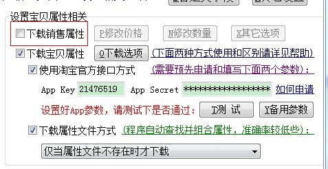 2、下载软件的选项里面去掉“下载销售属性”即可,下载出来的CSV文件“销售属性组合”没有数据;当然这个选项默认是勾选上的,在下载其它宝贝时请记得把这个选项重新选回,以确保数据的完整性。