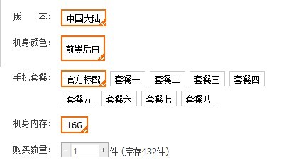 对比一下您会发现,新版的销售属性多了“机身内存”和“版本”两种新的类型,而比原来少了“网络类型”。