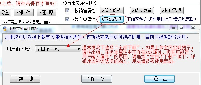 2、下载软件的选项里面:下载宝贝属性—>下载选项—>“用户输入属性”选择为“空白不下载”即可;当然这个选项默认是选择“全部下载”的,在下载其它宝贝时请记得把这个选项重新选回,以确保数据的完整性。
