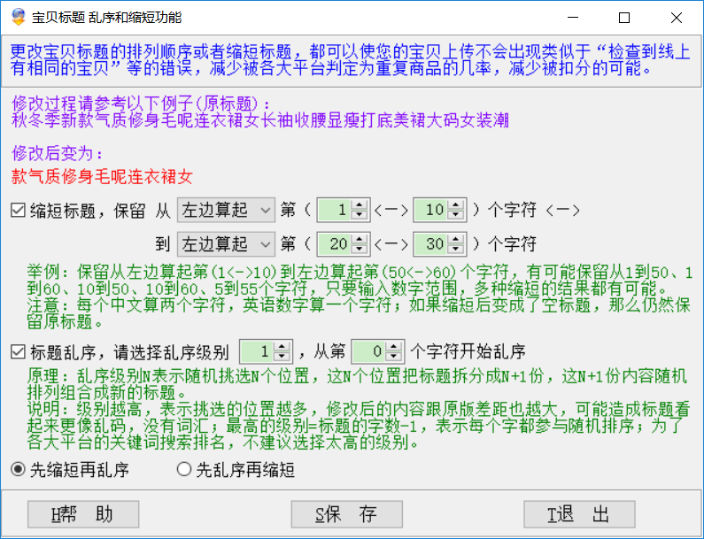 说明:级别越高,表示挑选的位置越多,修改后的内容跟原版差距也越大,可能造成标题看起来更像是乱码,没有词汇;最高的级别=标题的字数-1,表示每个字都单独参与随机排序;为了各大平台的关键词搜索排名,不建议选择太高的级别。