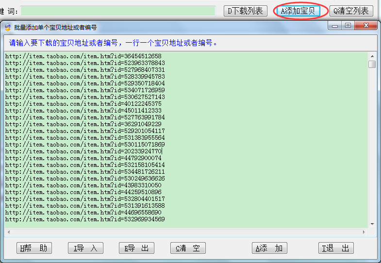 请输入要下载的宝贝地址或者编号,一行一个宝贝地址或者编号。