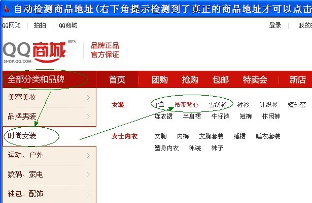 下载QQ网购(店铺地址除外)、女装、数码等分类、搜索 自动检测商品地址