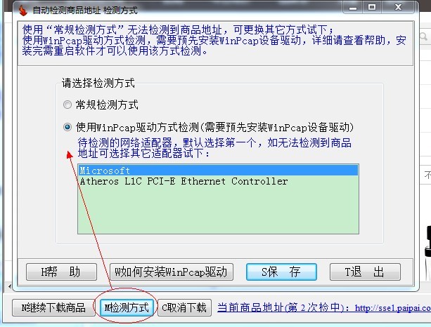 安装完WinPcap设备驱动,软件会加载所有待检测的网络适配器,默认选择第一个,如无法检测到商品地址可选择其它适配器试下。