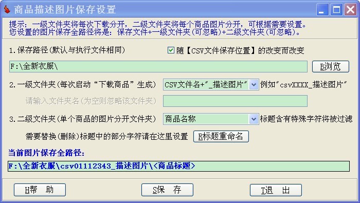 可以选择商品描述图片下载之后保存哪里,默认与CSV文件保存位置相同,名称为“csvXXXX_描述图片\<商品名称>”。