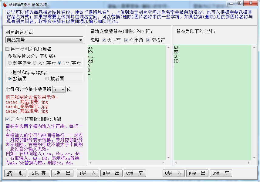 这里可以修改商品描述图片名称,建议"保留原名",上传到淘宝图片空间之后名字会被自动修改,也可以根据需要选择其它命名方式;如果您需要上传到其它域名空间,可以替换(删除)图片名称中的一些字符,如果替换(删除)后的新图片名称与现有图片同名,软件会在新名称后面添加编号加以区分。
