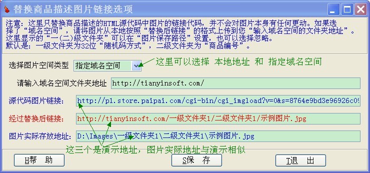 选择本地地址为默认,意思即为图片下载到本地,描述链接也引用本地这张图片。导入到拍拍助理上传时,助理会先将这张图片上传到图片空间再上传商品。前提是足够的空间。
