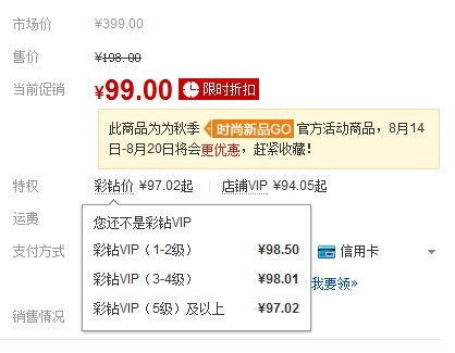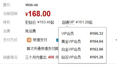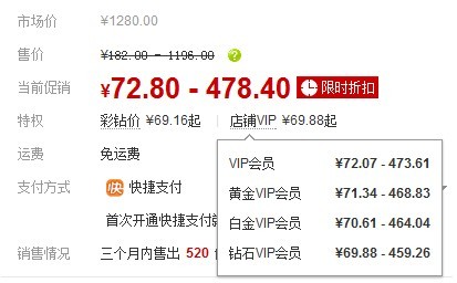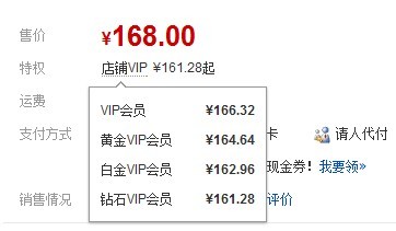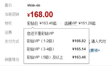 部分商品设置了彩钻价和店铺VIP价格,比如下面这个商品标价: