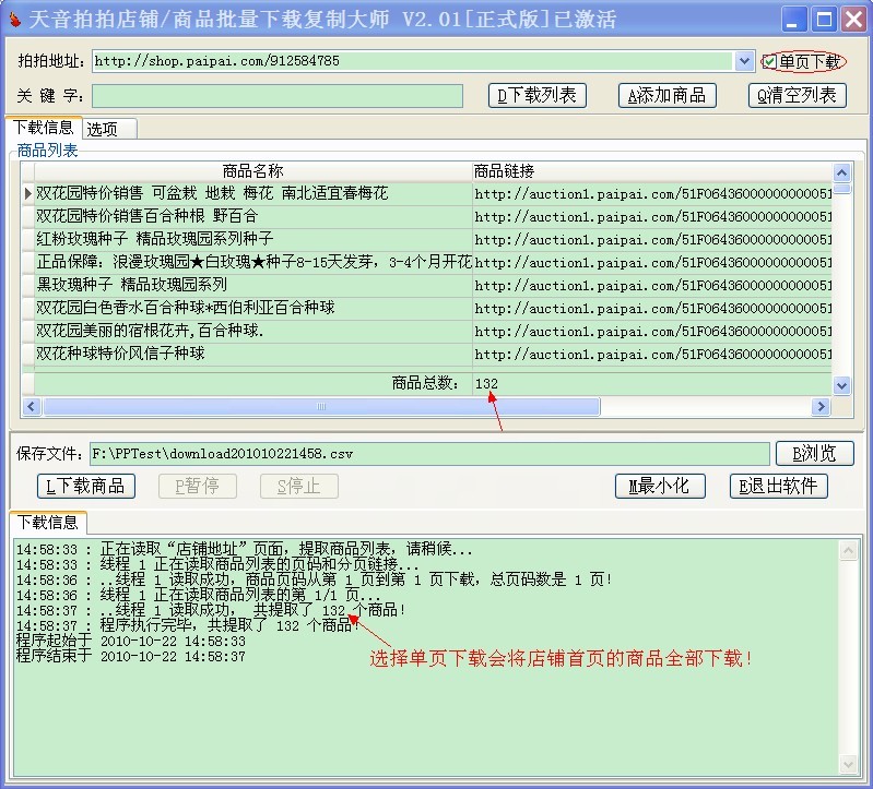 如果输入店铺首页地址,需要下载整个店铺,请把“单页下载”功能去掉,程序会自动识别并从“店铺地址”跳转到“所有商品”页面,下载整个店铺的商品!