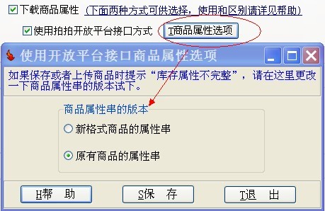 拍拍开放平台接口保留了新旧两种属性串,软件默认选择“新格式商品的属性串”,目前拍拍网里面大部分商品用新旧两种属性串都能成功上传,有少部分商品必须选择特定版本的属性串才不会报错,如果保存或者上传商品时提示“库存属性不完整”,请在这里更改