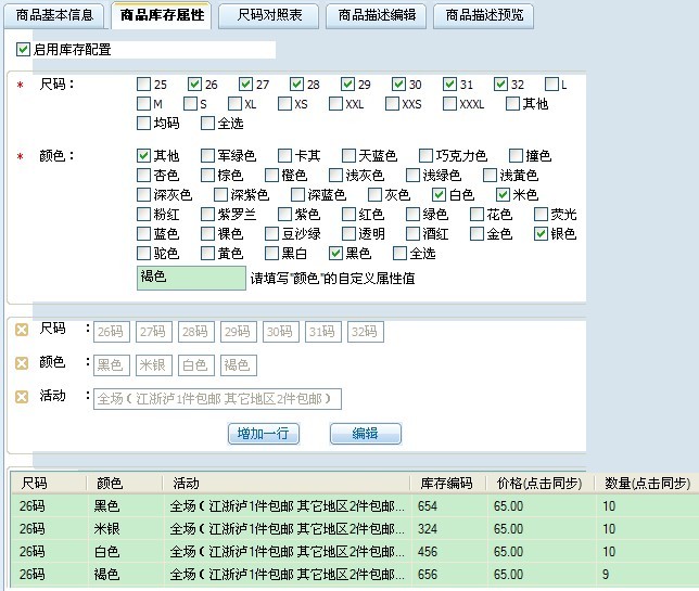 库存属性 是指商品的颜色、尺码、套餐等信息,拍拍助理里面部分类目的商品可以选择对应的颜色和尺码,并对颜色、尺码组合下设置不同的价格和库存数量、库存编码等等。