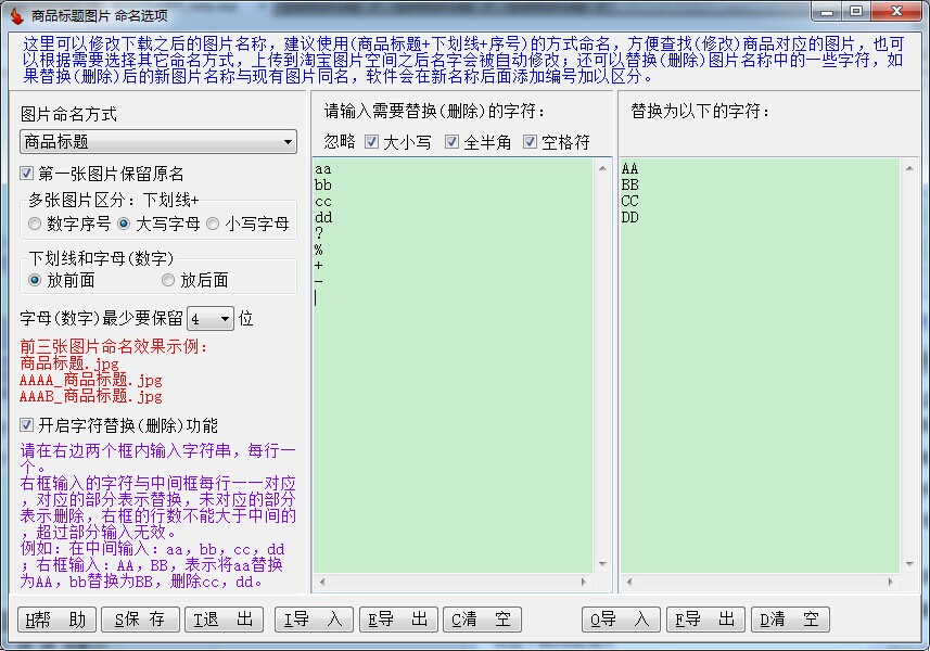 这里可以修改下载之后的图片名称,建议使用(商品标题+下划线+序号)的方式命名,方便查找(修改)商品对应的图片,也可以根据需要选择其它命名方式,上传到淘宝图片空间之后名字会被自动修改;还可以替换(删除)图片名称中的一些字符,如果替换(删除)后的新图片名称与现有图片同名,软件会在新名称后面添加编号加以区分。