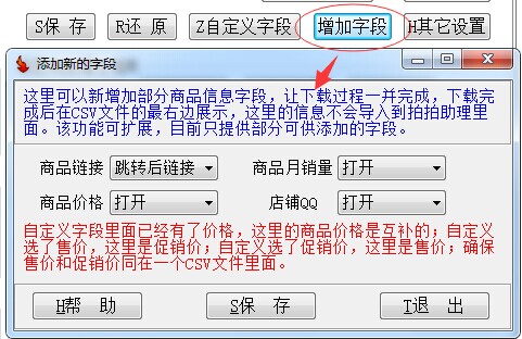 这里可以新增加部分商品信息字段,让下载过程一并完成,下载完成后在CSV文件的最右边展示,这里的信息不会导入到拍拍助理里面。该功能可扩展,目前只提供部分可供添加的字段。