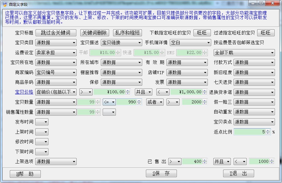 这里可以自定义部分商品信息字段,让下载过程一并完成。该功能可扩展,目前只提供部分可供更改的字段,大部分功能淘宝助理已提供,这里不再重复。商品的发布、上架、修改、下架的时间使用拍拍接口可准确获取源数据,带库存属性的商品才可以获取发布时间,默认都取当前时间。