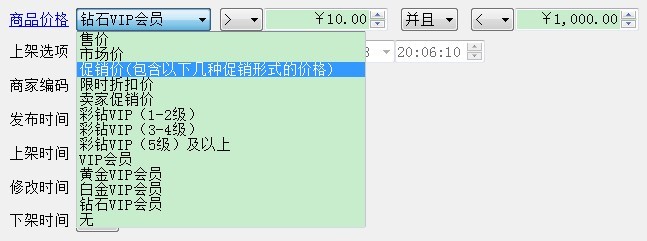 软件里面可以选择某种VIP价格下载;对于价格区间的商品,下载之后所有库存属性组合的价格遵循所选择的促销类型的价格,比如下面的商品选择了“钻石VIP会员”: