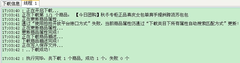 这两种方式不是互相排斥的,而是互为补充的关系,如果您把这两种方式都勾选的话,如果用第①种“使用拍拍开放平台接口方式”下载属性失败,那么软件会继续用第②种“下载类目下所有属性自动搜索匹配方式”去下载商品属性。软件下载信息提示: