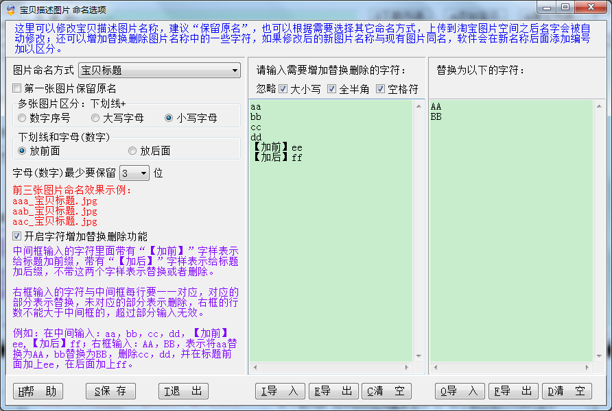这里可以修改宝贝描述图片名称,建议“保留原名”,也可以根据需要选择其它命名方式,上传到淘宝图片空间之后名字会被自动修改;还可以增加替换删除图片名称中的一些字符,如果修改后的新图片名称与现有图片同名,软件会在新名称后面添加编号加以区分,使用例子请参考宝贝主要图片(颜色图片)命名选项