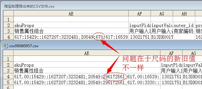 我们来对比一下宝贝下载软件下载出来的csv文件和淘宝助理修改正确之后重新导出来的csv文件,可以看出销售属性组合里面的尺码属性值不一样,导致导入淘宝助理之后尺码要么是空白的,要么是多余重复的