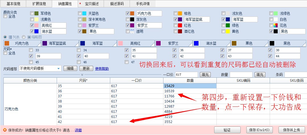 4、这时候发现淘宝助理已经自动把多余的尺码删除,接下来需要重新设置一下所有销售属性的价钱和数量,再点一次保存,然后再上传宝贝就不再出错了