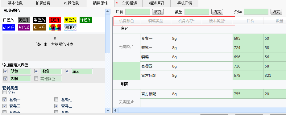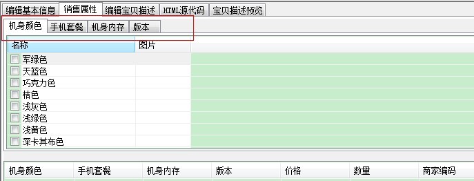 问题原因:原来的宝贝在以前上传的那个时间点,销售属性只有三种类型,而现在淘宝对“手机”类目更新之后,销售属性类型变成了四种。销售属性如果要在下面表格里面显示出来,四种类型每一种都至少要选中一个名称,缺一不可。