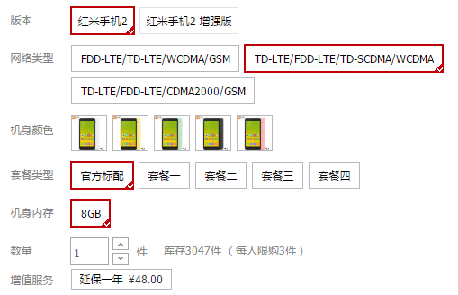请看下面手机类目的宝贝,“网络类型”是销售属性,可选择三种类型: