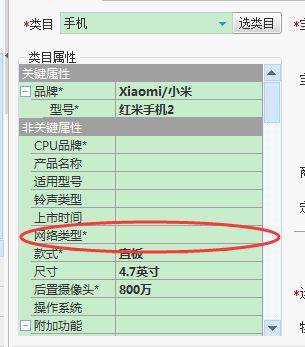 相反在“基本信息”的“类目属性”列表能看到“网络类型”,而且为必填属性: