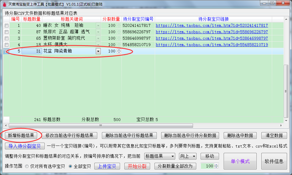 清空数据:清空对应表的数据,连同清除所有标题结果。清空之后再新增标题结果,或者导入待分裂宝贝,对应表的数据编号又从1开始了。