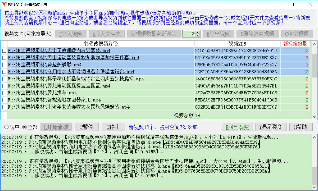 该软件能够修改原视频的MD5,生成多个不同MD5的新视频。软件不但可以用于裂变视频,还可以裂变图片,裂变任意电脑的文件。
