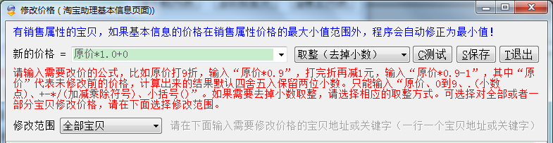 公式输入要求:请输入需要改价的公式,比如原价打9折,输入“原价*0.9”,打完折再减1元,输入“原价*0.9-1”,其中“原价”代表未修改前的价格,计算出来的结果默认四舍五入保留两位小数。只能输入“原价、0到9、.(小数点)、+-*/(加减乘除符号)、小括号()”。如果需要去掉小数取整,请选择相应的取整方式。可选择对全部或者一部分宝贝修改价格,请在下面选择修改范围。