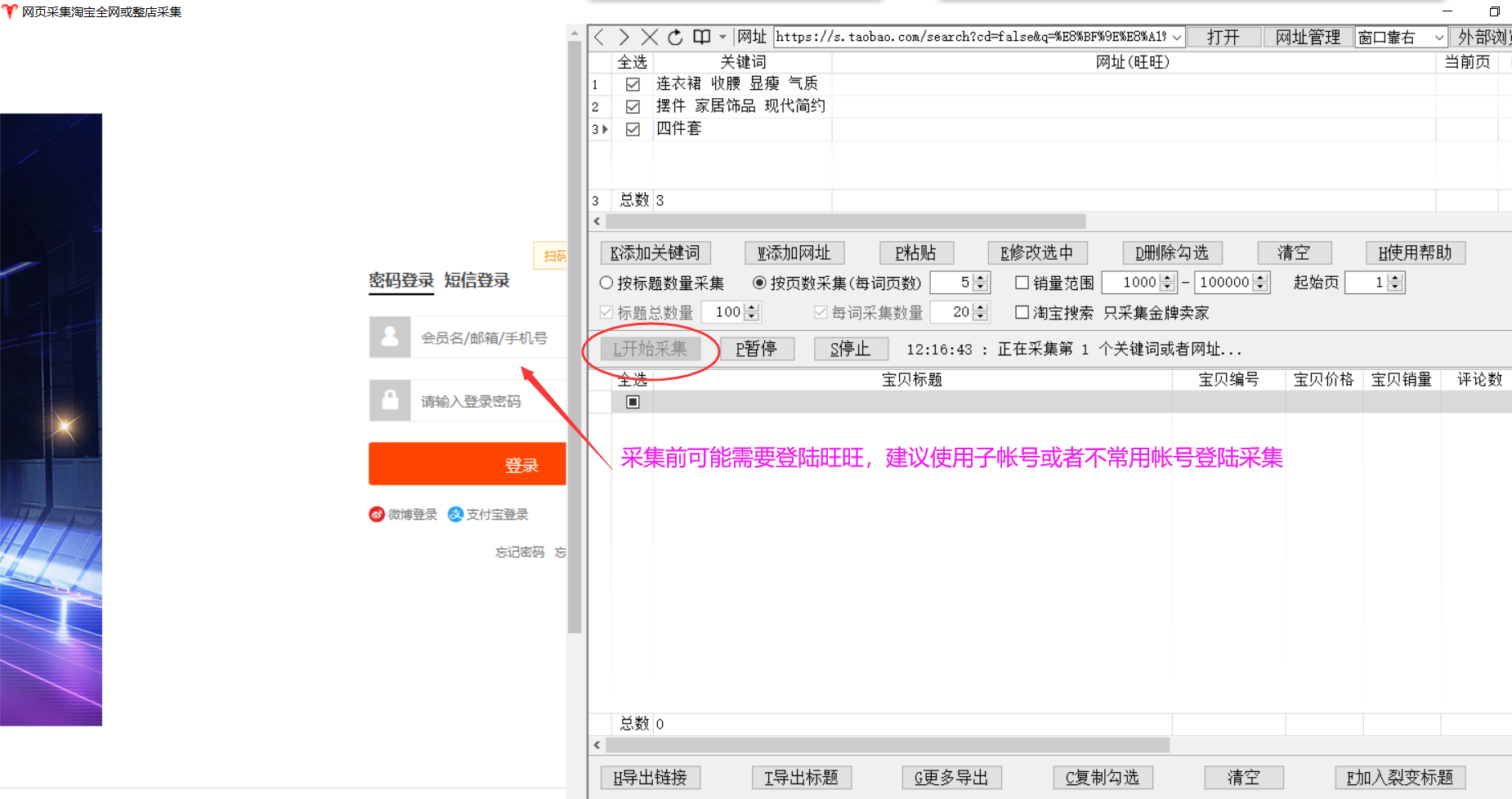▼采集之前可能需要登陆旺旺,可在左侧网页窗口登陆,建议使用不常用的买家帐号或者子帐号登陆采集,减少滑块限制;