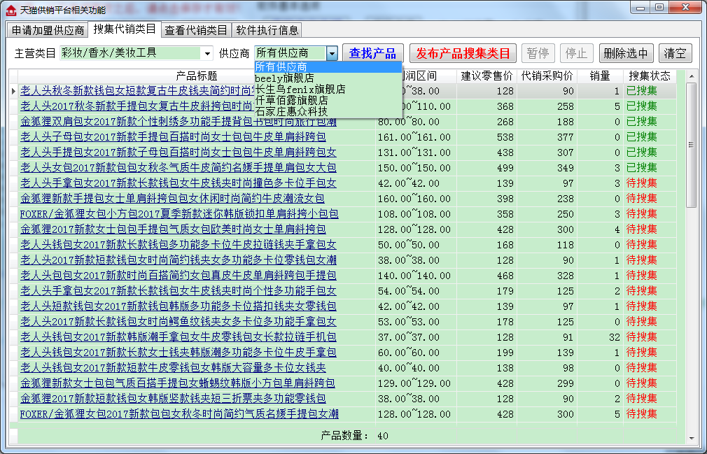 增加天猫供销平台相关功能,可批量申请加盟供应商,可搜集合作供应商代销产品等,